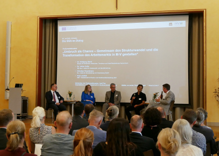 An der anschließenden Podiumsdiskussion zum Thema „Umbruch als Chance – Gemeinsam den Strukturwandel und die Transformation des Arbeitsmarkts in M-V gestalten“ nahmen neben Minister Dr. Wolfgang Blank und GSA-Geschäftsführerin Anja Leulleik außerdem Dr. Volker Kotte vom Institut für Arbeitsmarkt- und Berufsforschung (IAB) Nord sowie Christian Rosenkranz als Geschäftsführer der ibu institut für berufsbildung und umschulung gmbh in Neustadt-Glewe teil. Moderiert wurde die Podiumsdiskussion von Axel Fick, Geschäftsführer der TGS – Gesellschaft für Strukturentwicklung mbH und Projektleiter von mv-works (Kompetenzzentrum Arbeit 4.0 M-V). Alle Teilnehmenden waren sich einig, dass die berufliche Weiterbildung eine Schlüsselrolle einnimmt, um die aktuellen Herausforderungen der Transformation zu bewältigen. Die Teilnehmenden diskutierten dabei konkrete Lösungsansätze, um die Weiterbildungsbeteiligung von Unternehmen und Beschäftigten zu erhöhen und die Weiterbildungskultur in Mecklenburg-Vorpommern zu stärken. Hierbei betonten sie, dass die unterschiedlichen Herausforderungen besser gemeinsam, also Hand in Hand zwischen Politik, Verwaltung, Wissenschaft und Wirtschaft gemeistert werden können.