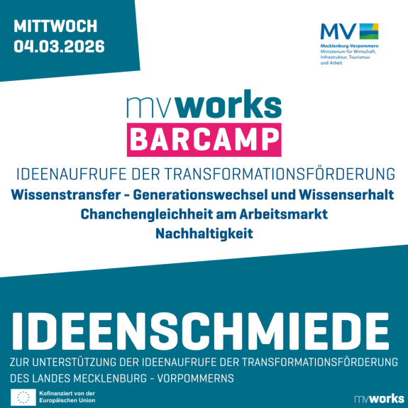 Am 04.03.2026 lädt das Team von mv-works zum Barcamp "Ideenschmiede Fachkräftesicherung" ins TZW Warnemünde ein.